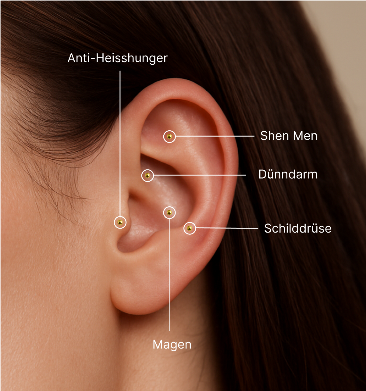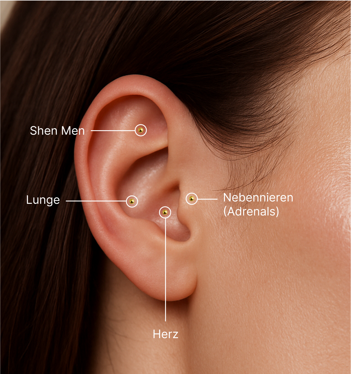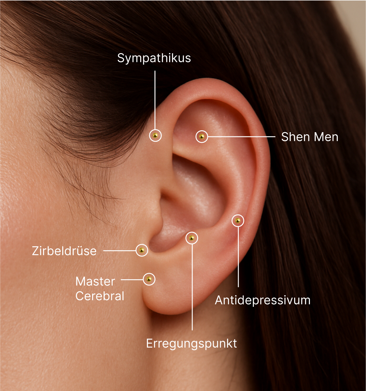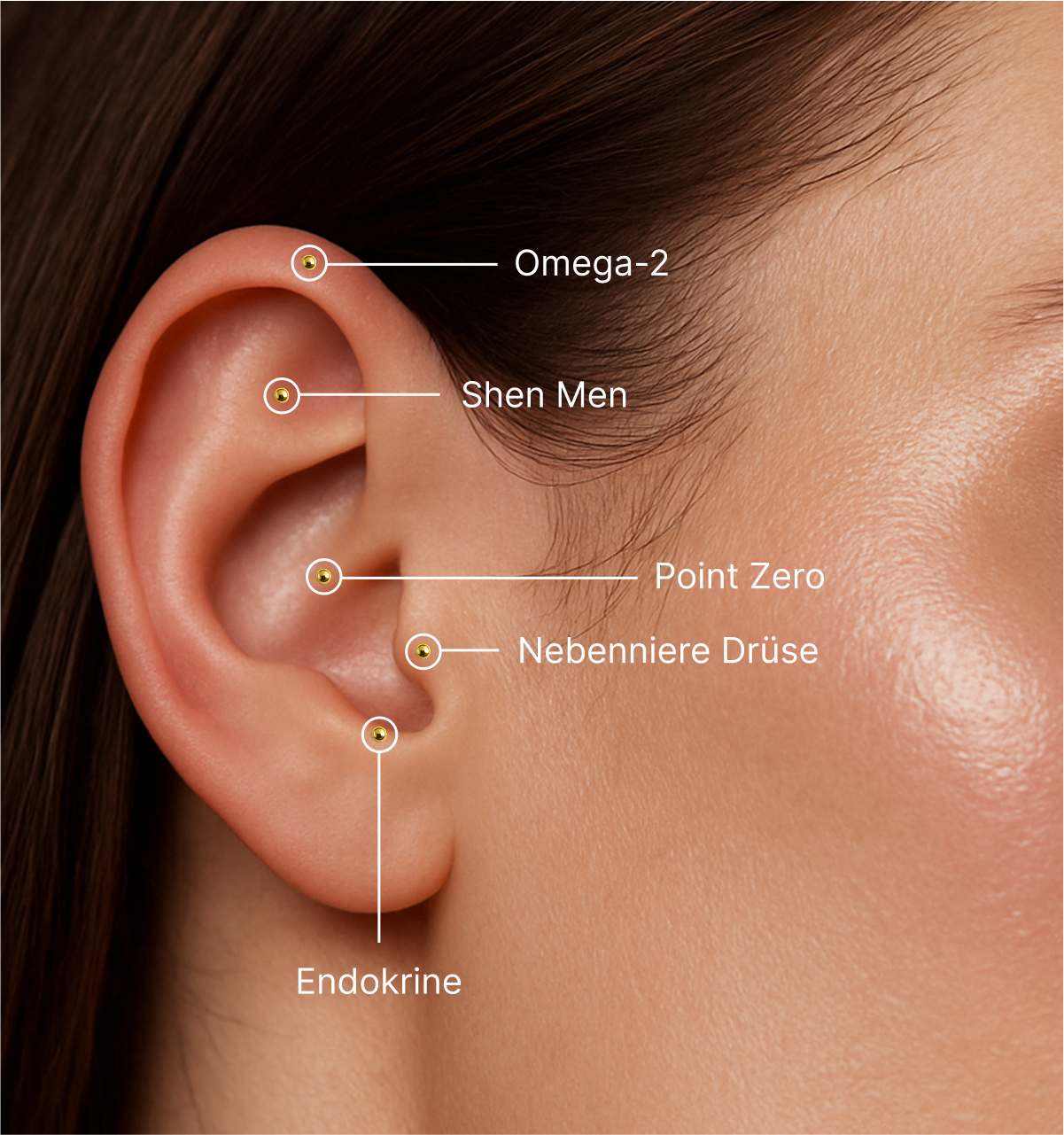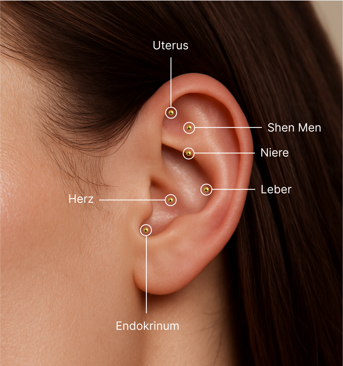 Diese Aurikulotherapie-Kombination bestimmter Punkte unterstützen die Regulation des endokrinen Systems, helfen beim Ausgleich hormoneller Schwankungen und können Beschwerden wie PMS, Menopausensymptome oder Schilddrüsenfunktionsstörungen lindern. Klinische Beobachtungen und Studien belegen positive Effekte auf Zyklusregulation, Stoffwechsel und Stresshormonhaushalt: